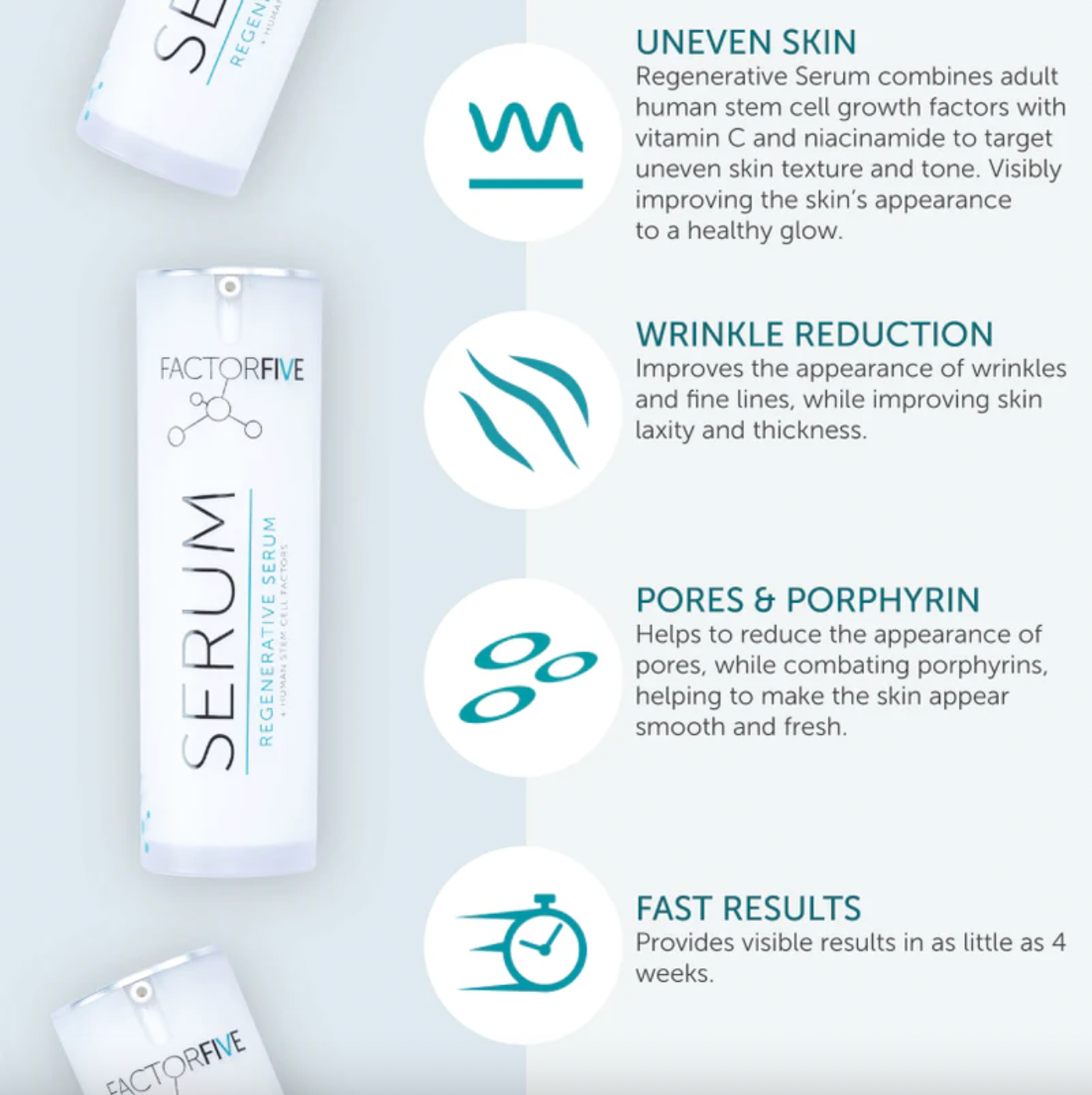 Our best-selling serum deviates from traditional anti-aging skincare to target the FIVE signs of aging: wrinkles, sun spots, skin laxity, thickness, and uneven texture. Our potent Regenerative Serum combines human stem cell-derived growth factors with copper peptides to help restore your skin.